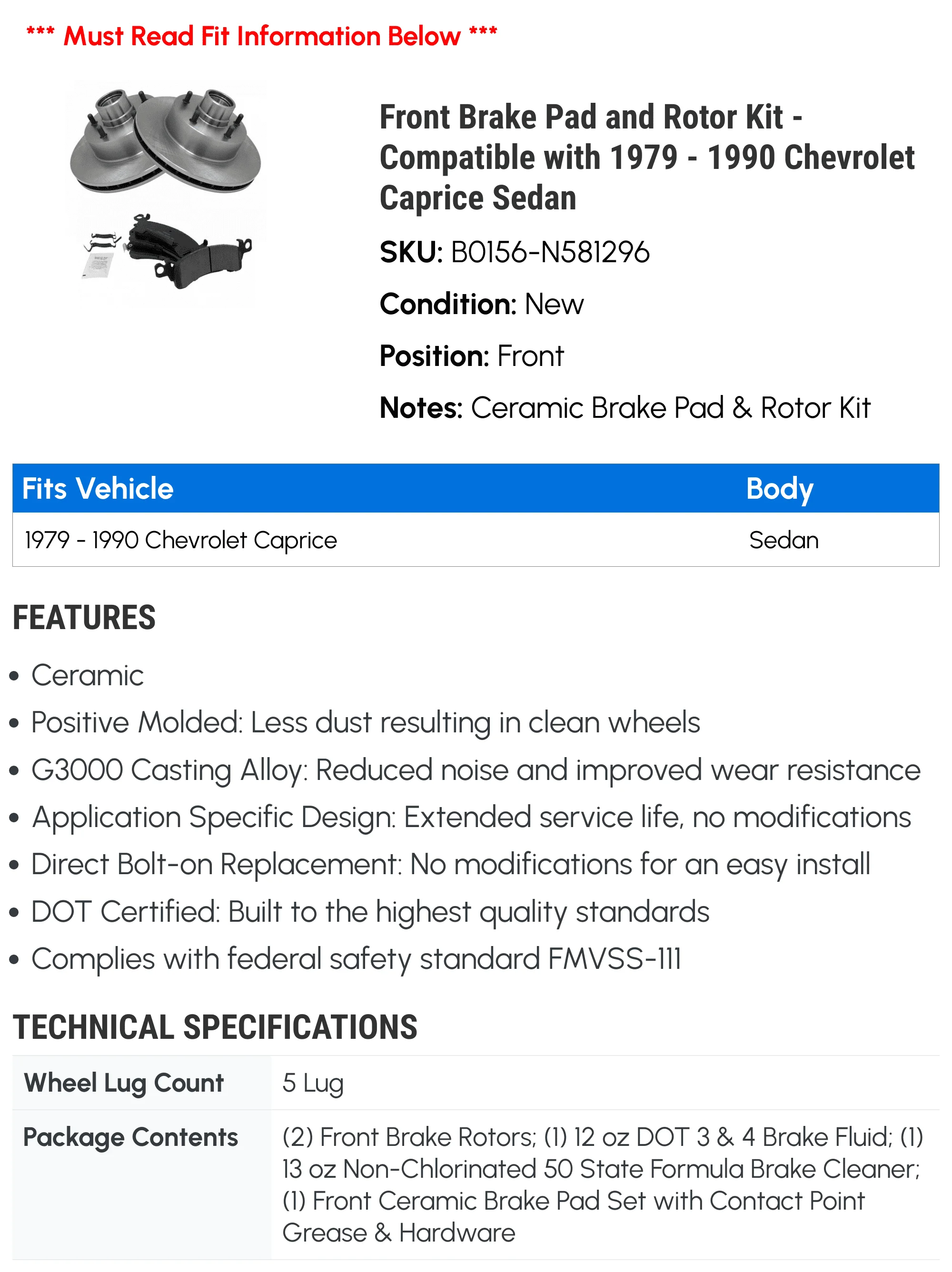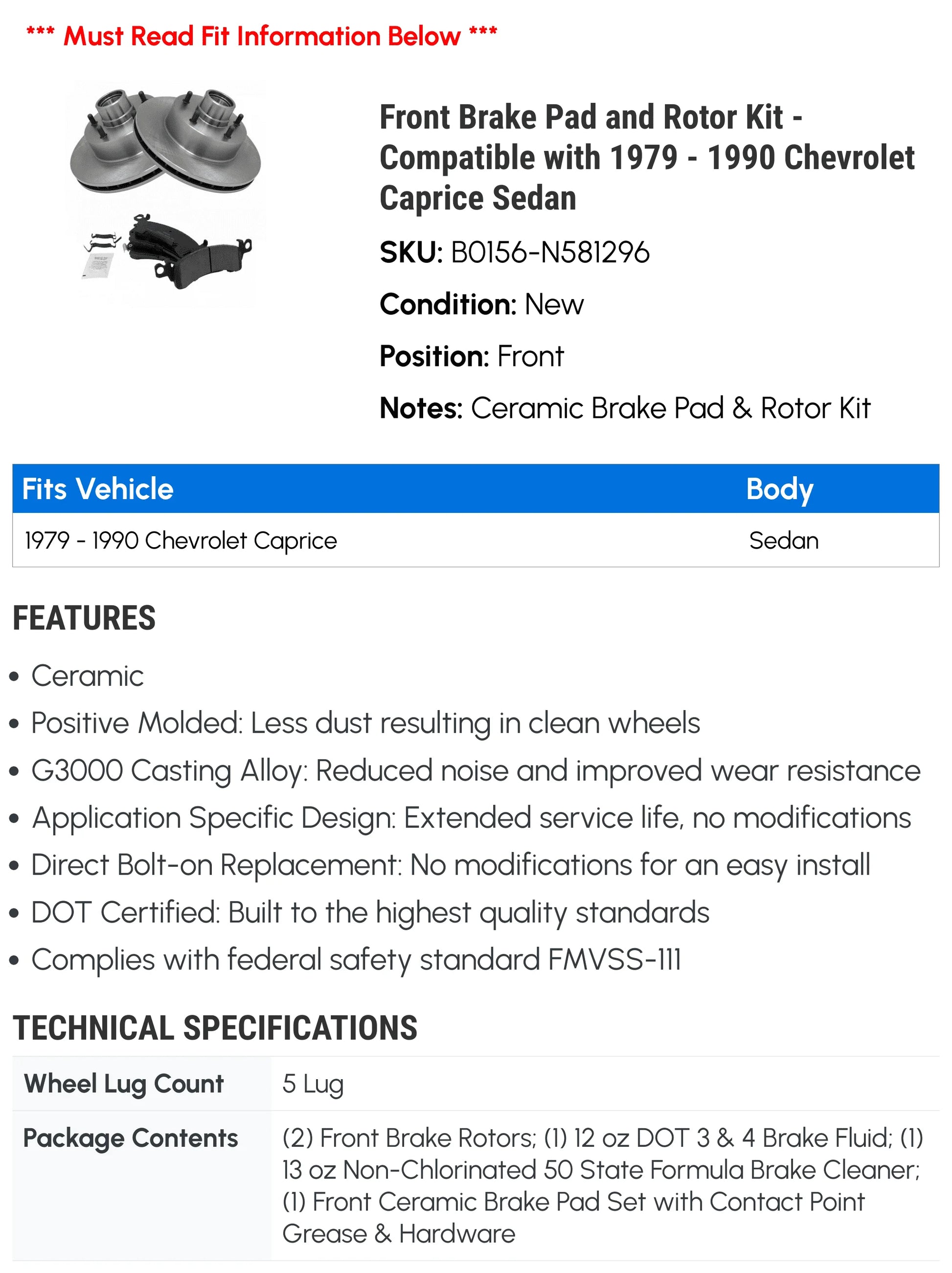 1. Front Brake Pad and Rotor Kit - Compatible with 1979 - 1990 Chevy Caprice Sedan 1980 1981 1982 1983 1984 1985 1986 1987 1988 1989