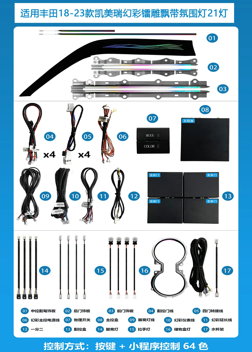 New LED Car Inner Ambient light For Toyota Camry Generation 8 2018-2023 Ribbon Dynamic Magic Color Ambience lamp APP contr